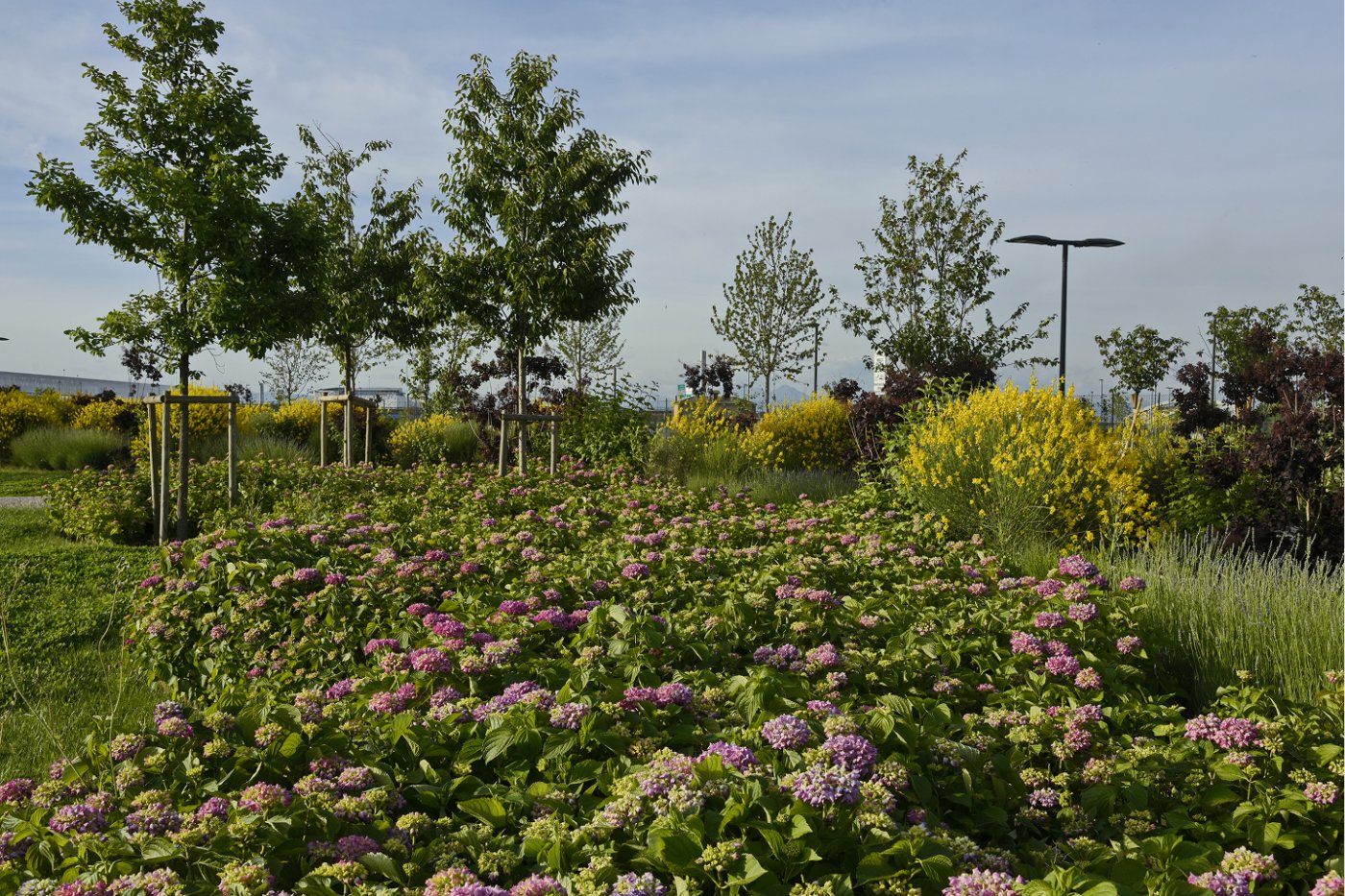 I prati sono realizzati con una composizione di specie diversa secondo le differenti finalità: il parterre centrale che deve sopportare il calpestio e un’intensa fruizione, corrisponde a un prato rasato destinato al taglio frequente. Gli ampi margini alberati del parco sono invece a prato rustico fiorito, con carattere più naturalistico e ornamentale, e sono destinati a pochi tagli l’anno per apprezzarne le fioriture.
